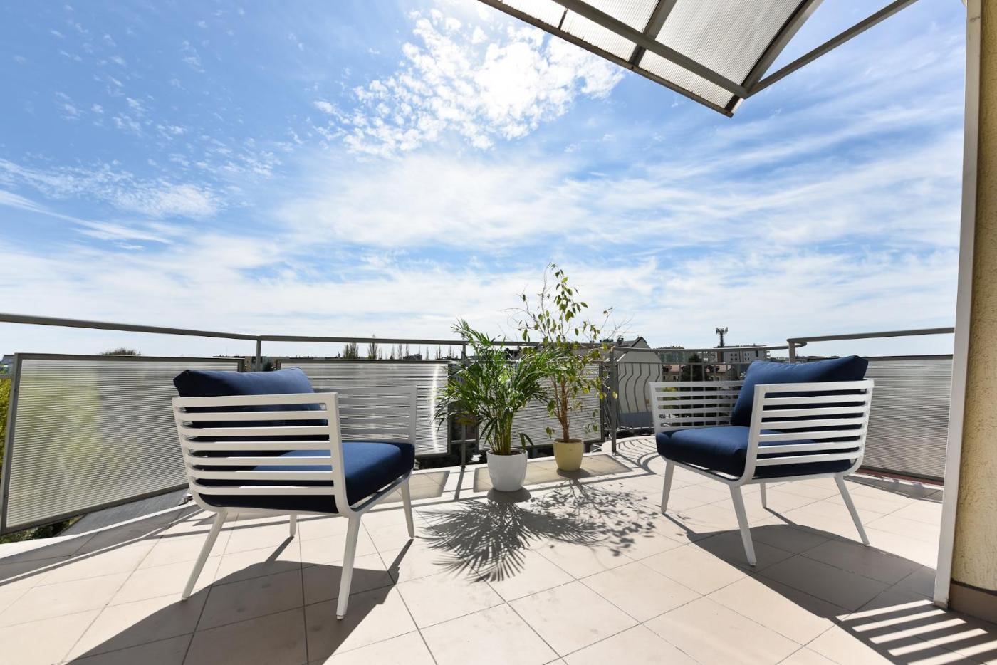 W apartamencie zapewniono sypialnię (1), łazienkę (1), pościel, ręczniki, jadalnię oraz kuchnię z pełnym wyposażeniem. Do dyspozycji Gości jest także telewizor z płaskim ekranem z dostępem do kanałów kablowych oraz taras z widokiem na miasto.