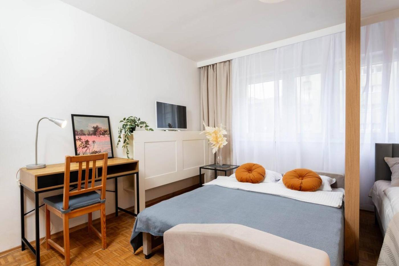 Studio typu Deluxe. The studio offers a washing machine, a private entrance, as well as a shared bathroom boasting a bath and a hairdryer. Meals can be prepared in the kitchen, which has a stovetop, a refrigerator, a dishwasher and kitchenware. The studio provides a tea and coffee maker, a dining area, a wardrobe, a flat-screen TV, as well as a quiet street view. The unit has 2 beds. Studio - 4 osobowy. Powierzchnia pokoju ok.: 26 mkw.